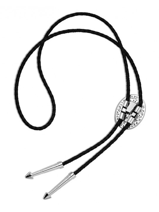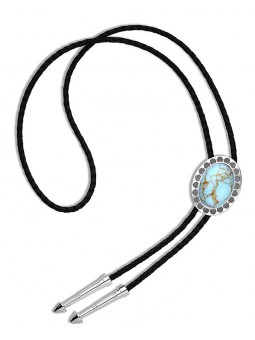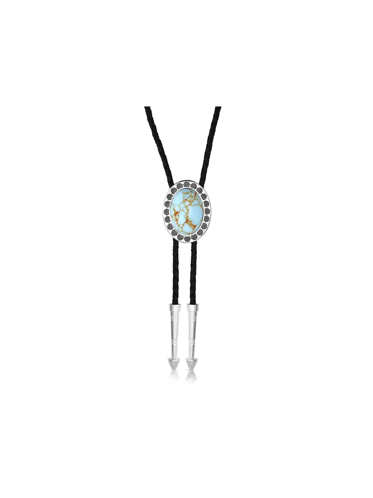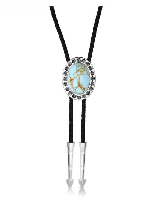 Elevate your style with the Turquoise Waters Bolo Tie. This bolo tie features a stunning oval-shaped light turquoise stone. A silver tone border with simple etching encircles the turquoise stone. The black braided leather cord is nicely weighted with two silver-toned arrow-pointed tips.