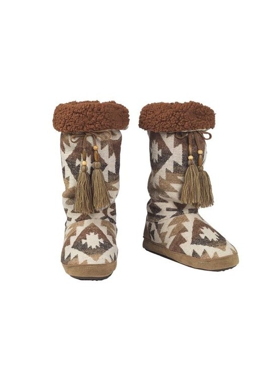 Diese Hausschuh-Boots sind in verschiedenen Brauntönen und Erdtönen im trendigen Aztekenmuster. Sie sind im oberen Bereich mit Quasten zum Binden versehen und mit einer kissenweichen EVA-Innensohle sowie einer TPR-Außensohle ausgestattet.