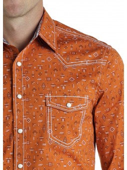 Longsleeve slim stretch two pocket snap with double chain-stitch on shoulders, yokes, collar, front placket, pockets and flaps. Grosgrain trim inside collarband. Contrast undercuffs and inside collarband. Chainstitch detail on hem and cuffs.