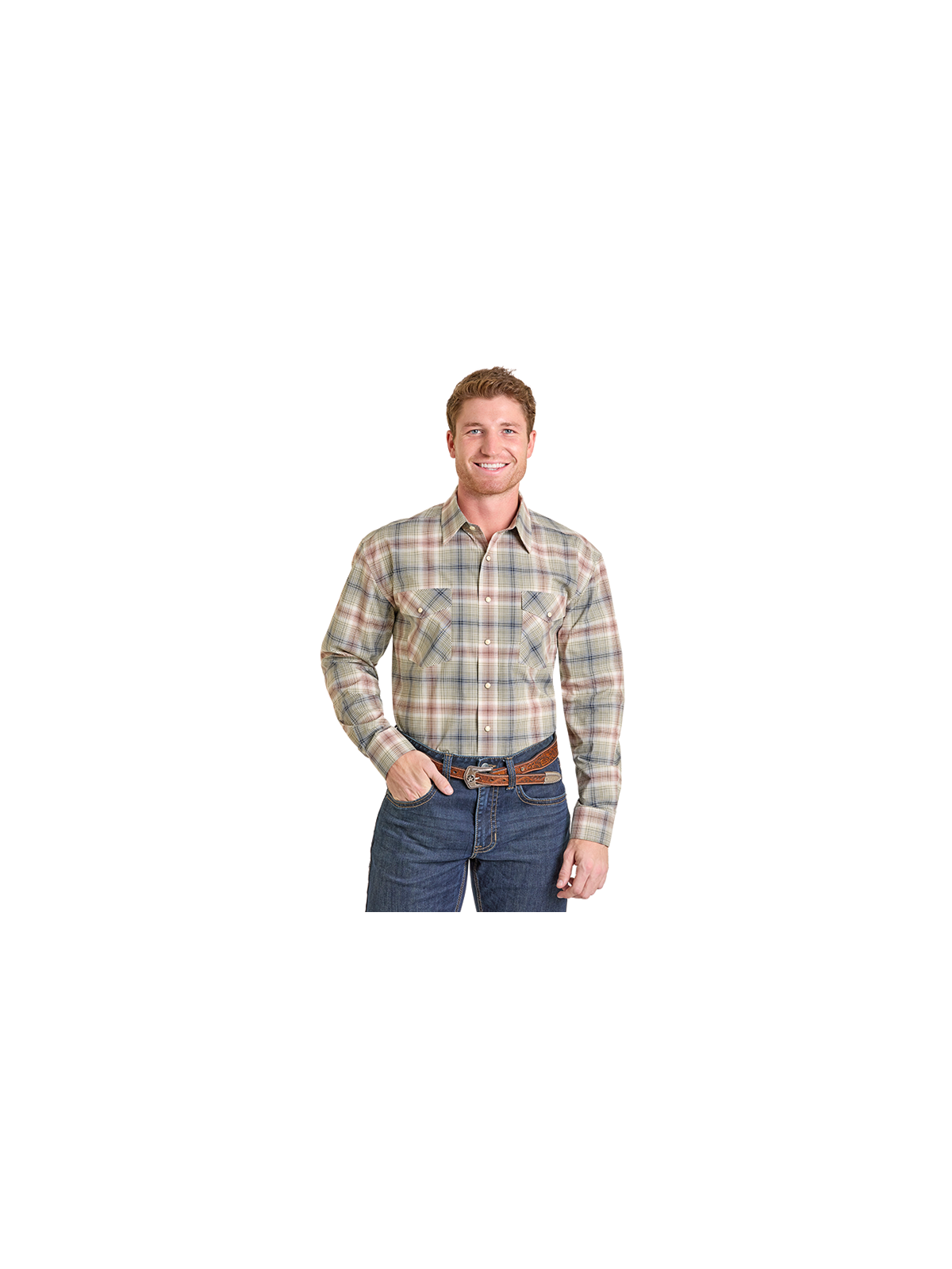 Taupe Plaid Long Sleeve Snap Front Shirt.