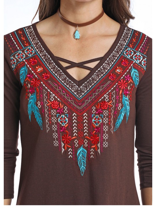 Braunes Damen 3/4 Arm Top mit asymmetrischem Saum und aufwändiger mehrfarbiger Stickerei.