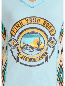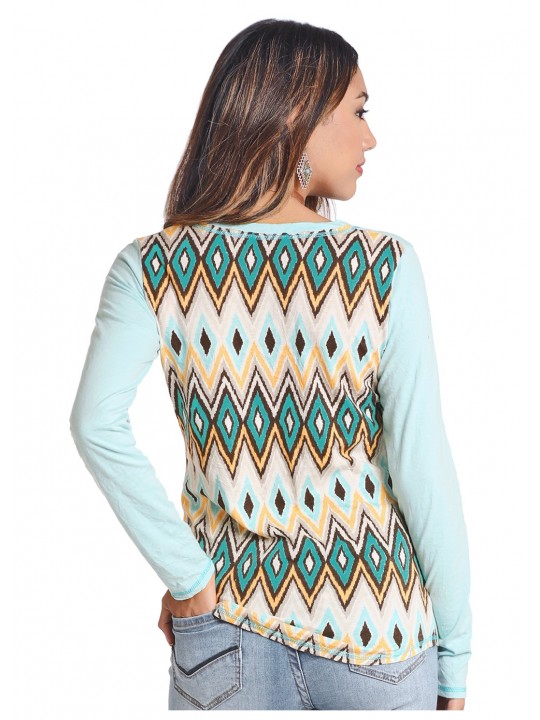Longsleeve V-Neck top with contrast printed front side panels and back. Raw edge detail at neckline and contrast stitching. Distress wash.