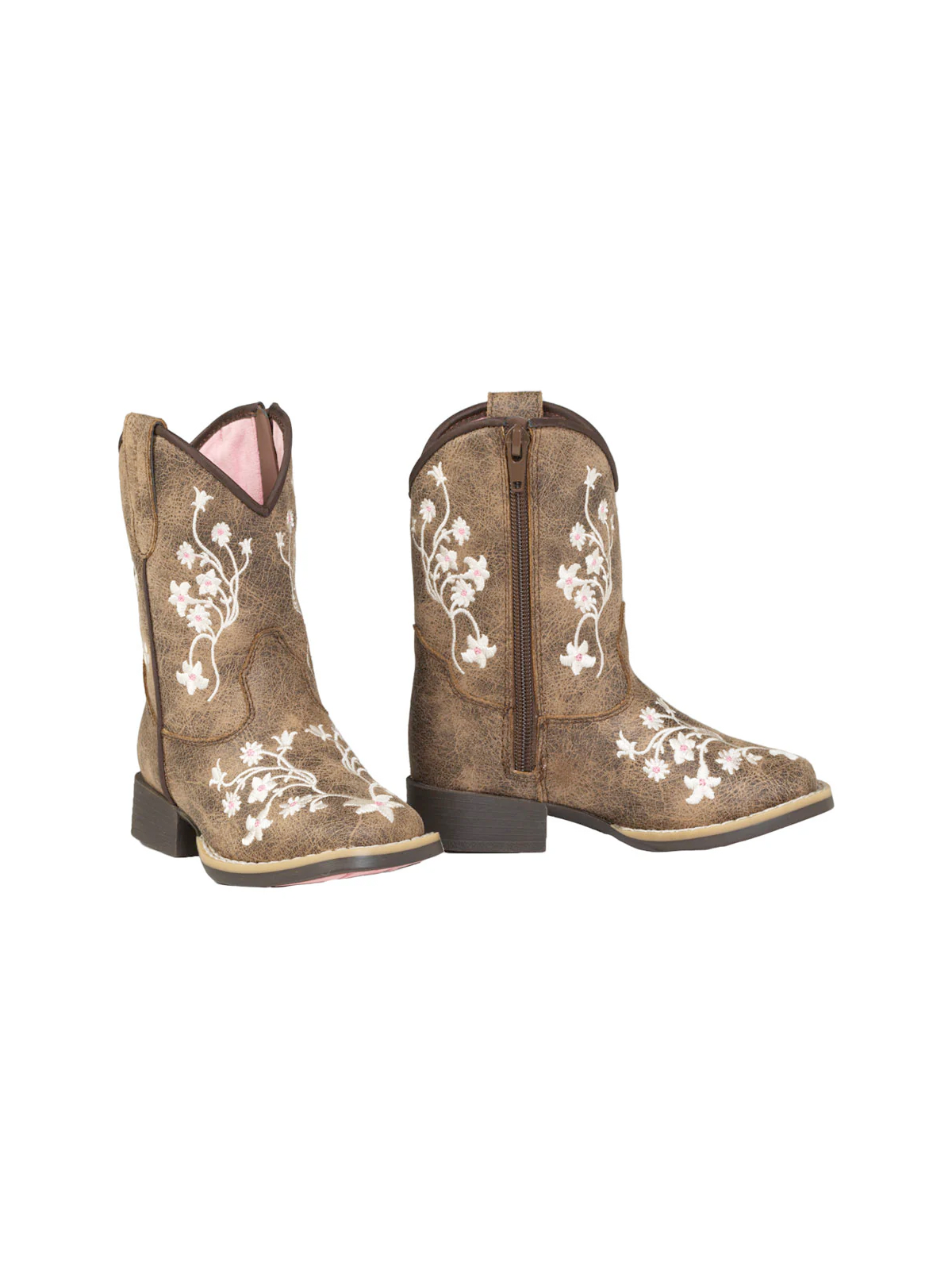 All day fun in these Twister toddler boots. White embroidered flowers on boot and brown piping along the top and side. Light pink fabric and mesh inside. Size zipper for easy on and off. Super comfortable for all day wear.