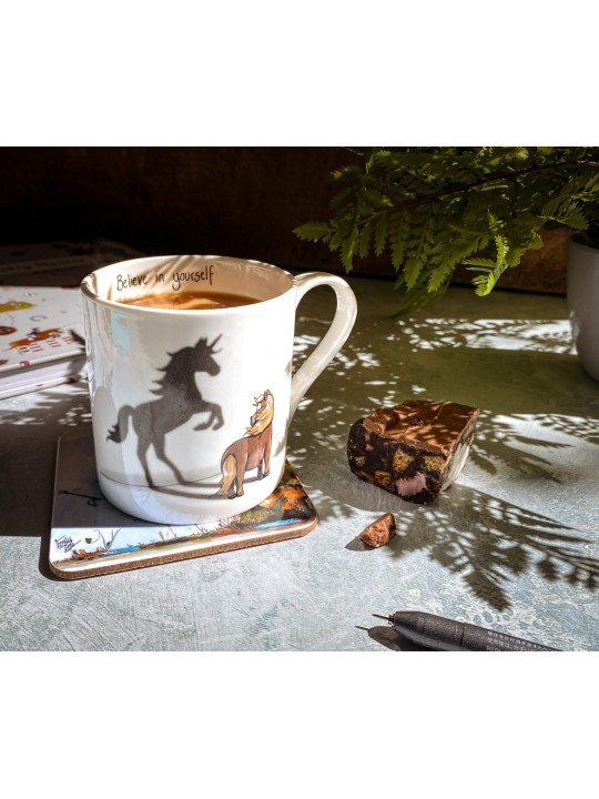 ‘Believe in Yourself’ Available as one the most special mug designs we have ever had printed. It is a design that means a lot to Emily on a personal level. The charming Flaxen Shetland gazes at his ‘Unicorn’ shadow reminding us all to believe in ourselves.