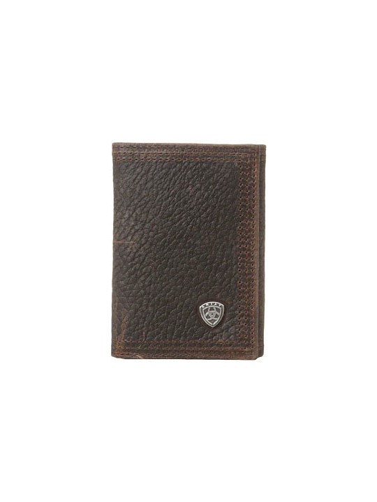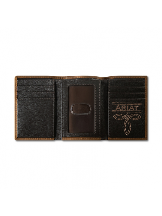 Diese Ariat Trifold-Geldbörse besteht aus oil-tan Leder in dunklem Kupferton und ist mit einem Ariat Marken-Concho versehen. Im Inneren befinden sich ein transparentes Ausweisfach, Kreditkartenfächer, ein herausnehmbares Fotofach sowie Fächer für Geldscheine.