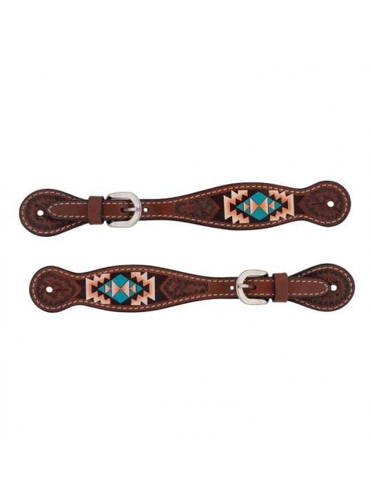 - Light-oiled leather ladies' spur straps feature a combination of tooling and hand-painted Aztec design accents