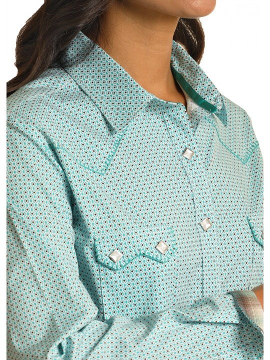 Verleihen Sie Ihrem Western‑Look ein modernes Upgrade mit dieser eleganten Damenbluse aus der Rough Stock‑Kollektion. Das „Micro Diamond Geo“‑Printmuster setzt stilvolle Akzente, während die Kombination aus 97 % Baumwolle und 3 % Spandex für angenehmen Komfort und elastischen Sitz sorgt.