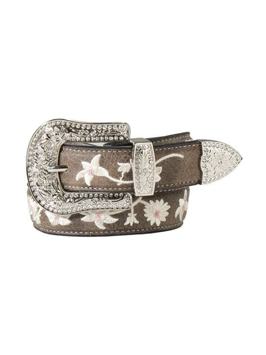 Top off her outfit with this girl’s belt from Angel Ranch. This cute leather belt has pink and white embroidered flowers along the body. The buckle is shiny silver with metal tips and crystals. 1 1/4" wide.