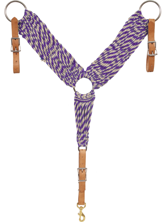 Strung breast collar with 29 strand 100% mohair in festive colors. Breast collar features premium leather tugs and 3” stainless steel rings.