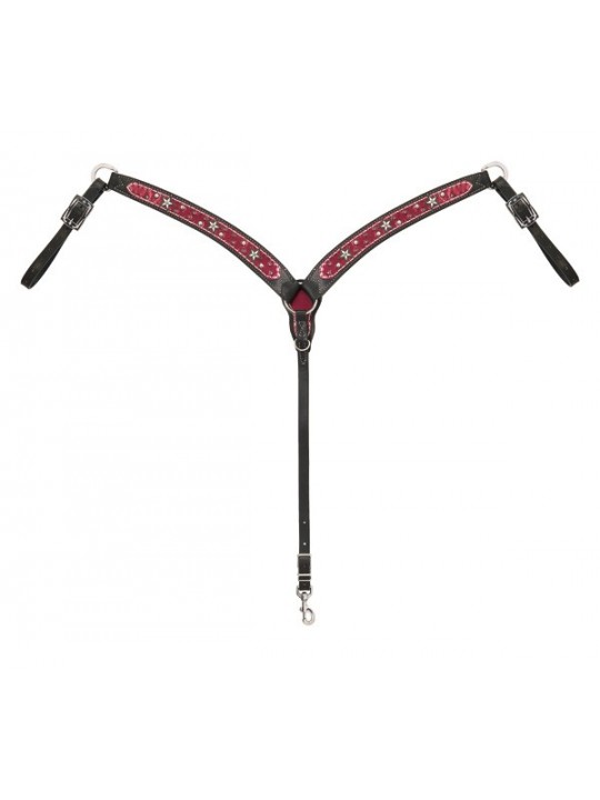Ideal for rodeo and mounted shooting, this black premium English bridle leather breast collar packs plenty of personality with burgundy metallic leather overlays, antiqued nickel star conchos, and clear and silver genuine Swarovski crystals. Pistol engraved stainless steel hardware with black accents offer the perfect finishing touch. Denim-inspired wide white stitching.