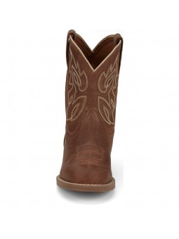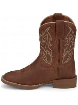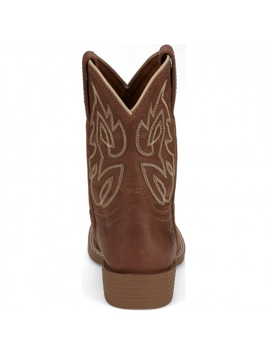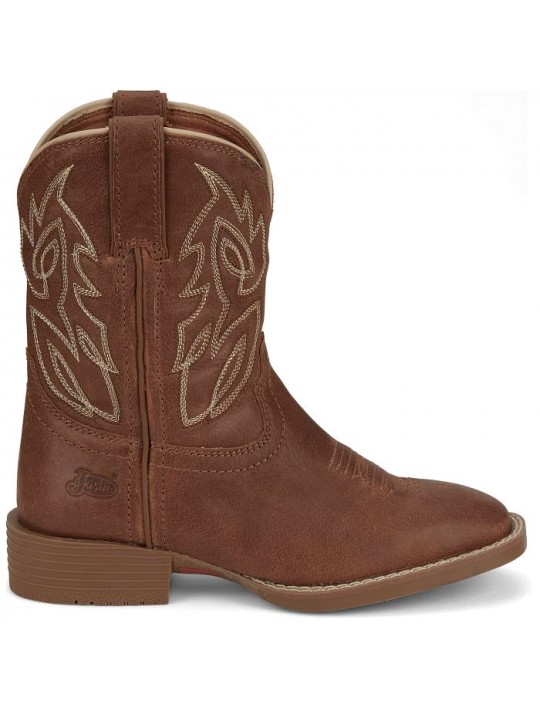 Durable 8″ kids’ western boot in Amber cowhide with square toe, cushioned insole, and rubber sole – classic Justin style for young riders and ranch kids.