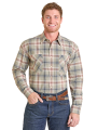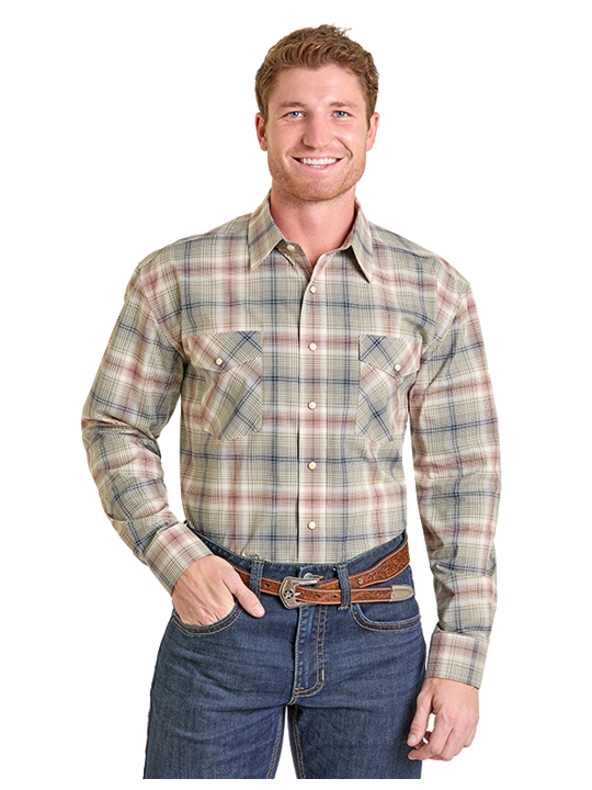 Taupe Plaid Long Sleeve Snap Front Shirt.