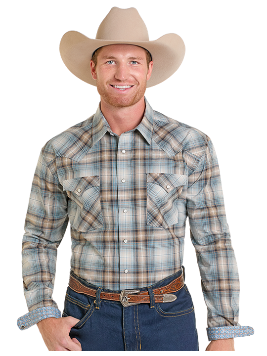 This camel, brown and light blue plaid Western shirt combines authentic cowboy style with modern comfort. The spread collar, snap-front closure, and two flap chest pockets with snap buttons highlight its classic Western charm. Made from a soft, comfortable fabric – perfect for the ranch, everyday wear, or casual outings.