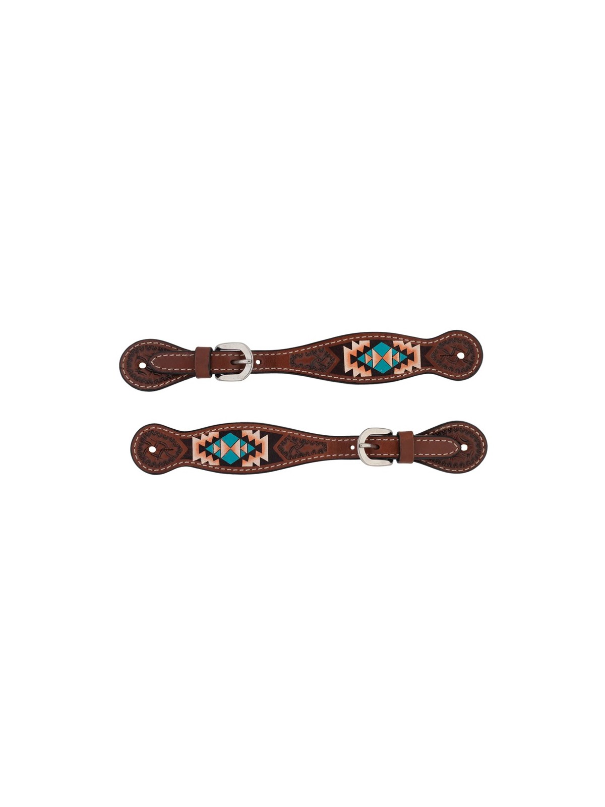 - Light-oiled leather ladies' spur straps feature a combination of tooling and hand-painted Aztec design accents