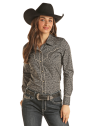 Western long-sleeved shirt with paisley print and diamond-shaped snaps.