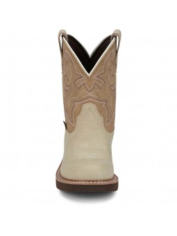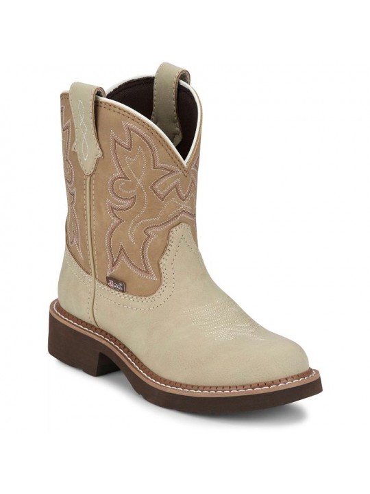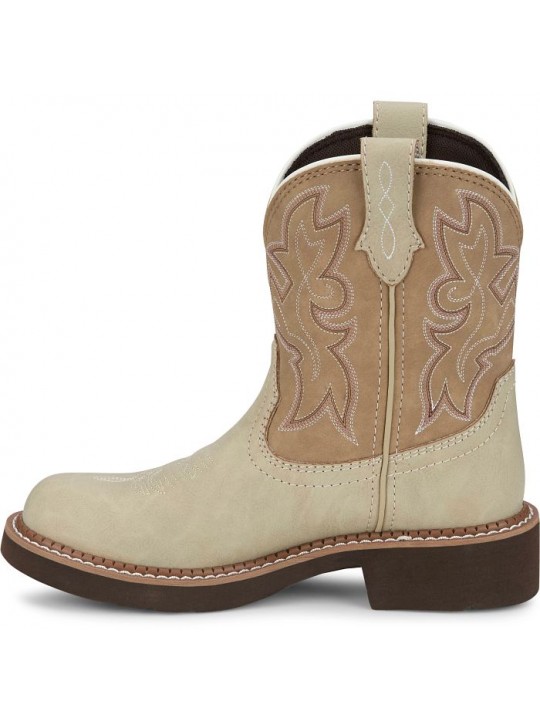 The Justin Kay 8″ Ladies' Western Boot in taupe-toned cowhide and natural tan shaft from the Justin Gypsy™ series blends rugged charm with feminine edge. With its vibrant stitching and round toe, it brings Western style to the street or stable. Built on the trusted Justin Gypsy™ profile, it offers a shorter shaft and wide walking heel for all-day comfort and freedom of movement.